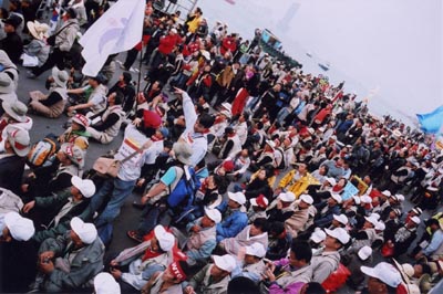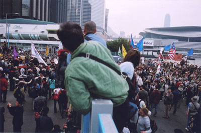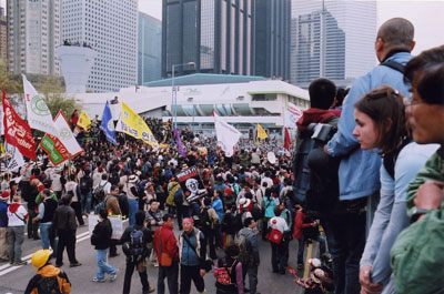 今天我走在遊行隊伍的後段,韓國人的鼓聲敲得很響很響,比2003年七一大遊行的鼓聲強十倍,我幾乎想起了《魔戒》電影裡的浩大震懾的場面。當然以《魔戒》打比喻委實負面,並不貼切。怎麼說?你看見他們遊行時唱歌、起舞,那是經過悉心排練的歌舞。他們頭戴卡其呢帽,帽邊圍上紅底白字"No WTO"頭巾,身穿背面絲印的"Down Down WTO!"圖案的背心,背心那麼精緻,韓國人向香港人示範了什麼是同舟共濟、團結一志的正義行動。於是,那個怒吼的鼓聲,是屬於包青天一派的,但比包青天的義怒強悍一百倍。