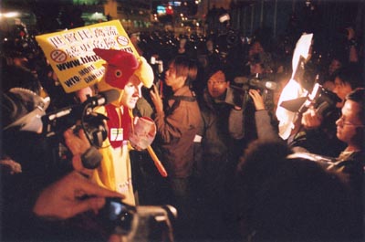 這時,無線電視女主播上場報導。她站在警方盾牌前,戴上防暴頭盔報導。報導中途,雞先生拿著迷你擴音器出場──雞先生是一位穿起一身雞衫的西人示威者,他舉起的牌子寫著「世貿比禽流感更危險」: