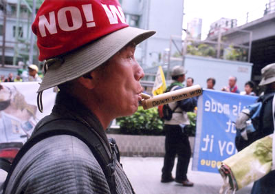 叔叔口中的竹製哨子,寫著「Down Down WTO」,又似煙斗。