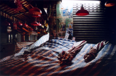 晚上一時,街燈從高處的樹葉叢滲出光線,松樹葉下垂,確實好像畫筆細毛一下一下掃落。要不是人太濕熱,踱著喝啤酒的話它倍覺好看,不過要澄清的是,這跟「感性的人喝啤酒散步」的一般浪漫想像毫無關係。