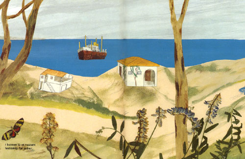 翻了本書幾遍,方發現幾幅畫面裡,除了如常的紙拼貼外,還貼了真植物在其上。表現草就用真草,表現花就用真花。真花藍,配水彩綠,再配塑膠彩藍,顏料與植物色澤配合,妙在不留痕跡。有人說繪畫是為了模仿自然,不論圖畫能否媲美大自然的美,動機都是受大自然的激發。Nordstrom以真花入畫,不為模仿,卻與大自然發生更直接的互動和對話。