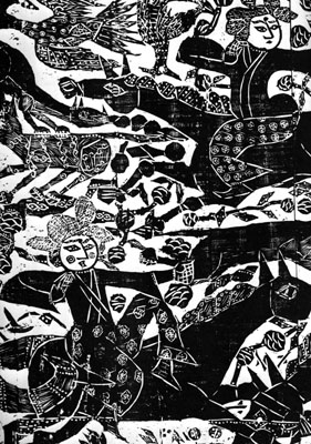 棟方為文學家插畫不多,他多製作宗教畫,僧侶菩薩是常見的主題。但說是宗教畫未免過份簡化,僧侶菩薩的貌相卻更像凡人,而且他刻刀下的世界比我們想像的宗教畫更具爆炸力:人物自由騰飛,傳統慶典遊人載歌載舞,彩墨狂飆奔竄,版印硬悍,書法奔放,勁力有如火槍往木板上燒灼,處處表現人天共融所激發的喜樂和生命力,真正的spiritually high。