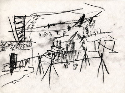 於是發現坐下來畫畫也無補於事,便拿起紙筆邊走邊畫。國畫有能讓人邊走邊看的質素,我瞎猜是因為畫者邊走邊畫。而將步移觀看的景物的不同角度收進畫紙,我懷疑西方「立體派」也是這樣子給搞出來的。詩人能七步成詩,畫者豈不可七步成畫?成不成好畫是另一回事,起碼走著的動態可以把壓抑胸中的熱忱,更適切地抒發。